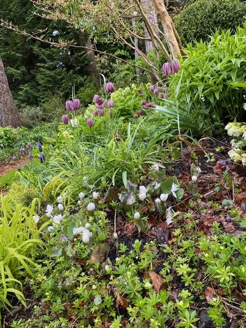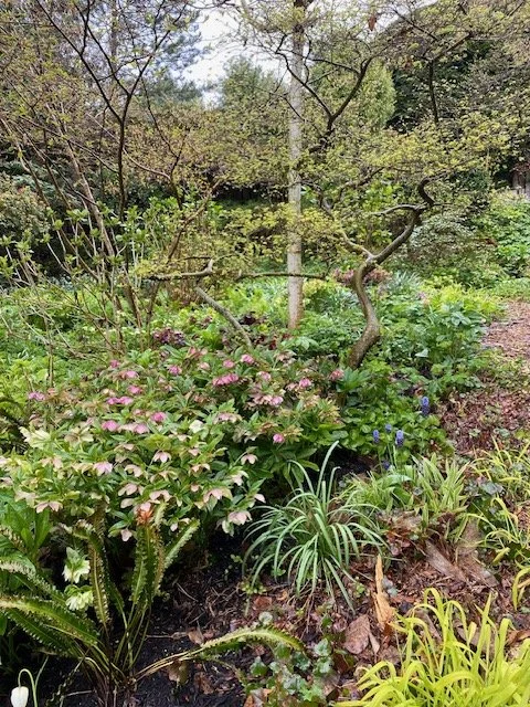 The garden was planned for winter and early spring interest. It seemed logical as there is an overstory of firs, and the slope receives the slanting rays of the winter sun. Needless to say, it’s very shady in the summer.